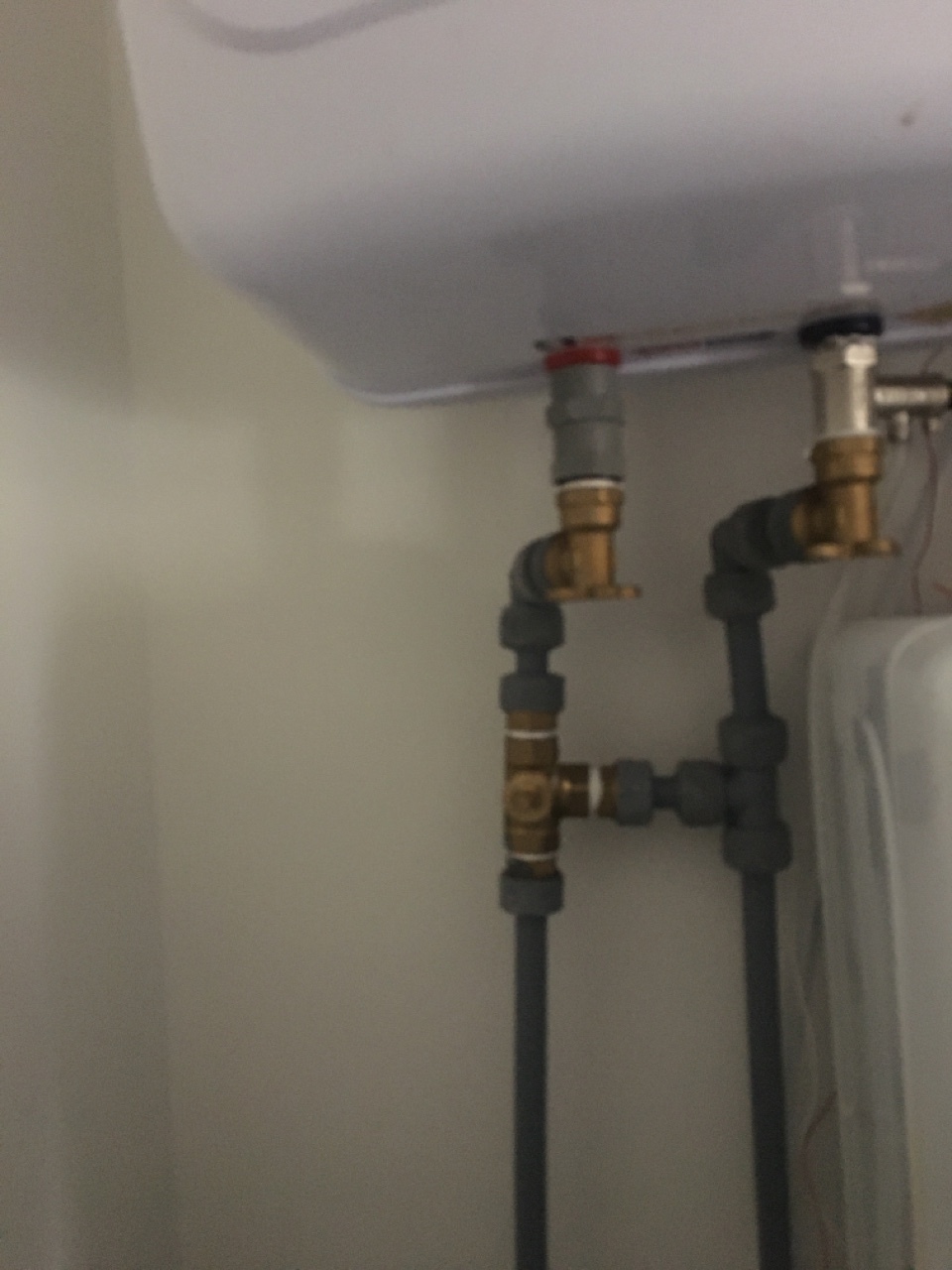아래사진에서 두개의 배관이 연결된 것은 본래 스위치 였다. 이부분에 온도센서와 전기 구동 벨브를 달았었다. 보일러에서 공급되는 온도가 일정 온도 이상이면 전기온수기를 통과하지 않게 만들었었는데, 사용해 보니 불 필요했다. 그래서 이 부분은 무시해도된다.