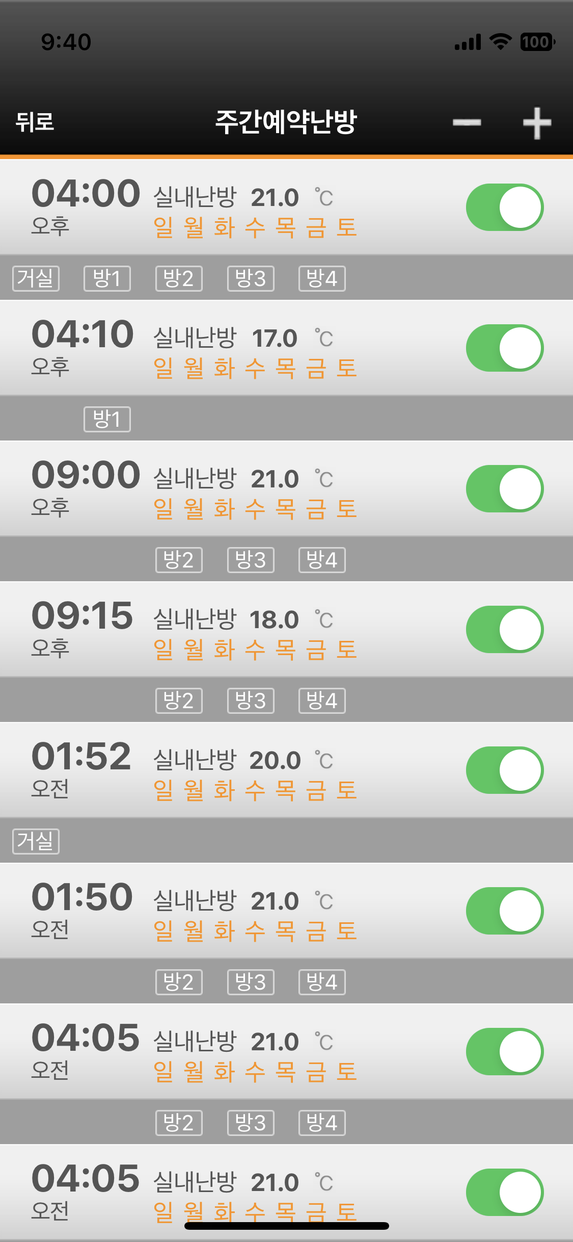경동 나비엔은 IOT 지원을 하는데요. 아파트와 약간 다르지만, 제 세팅 방법은 1시간에 10분 정도 보일러가 돌아가게 하는데, 대신 실내온도가 21도 이상인 방은 보일러가 돌지 않게 세팅하였습니다.