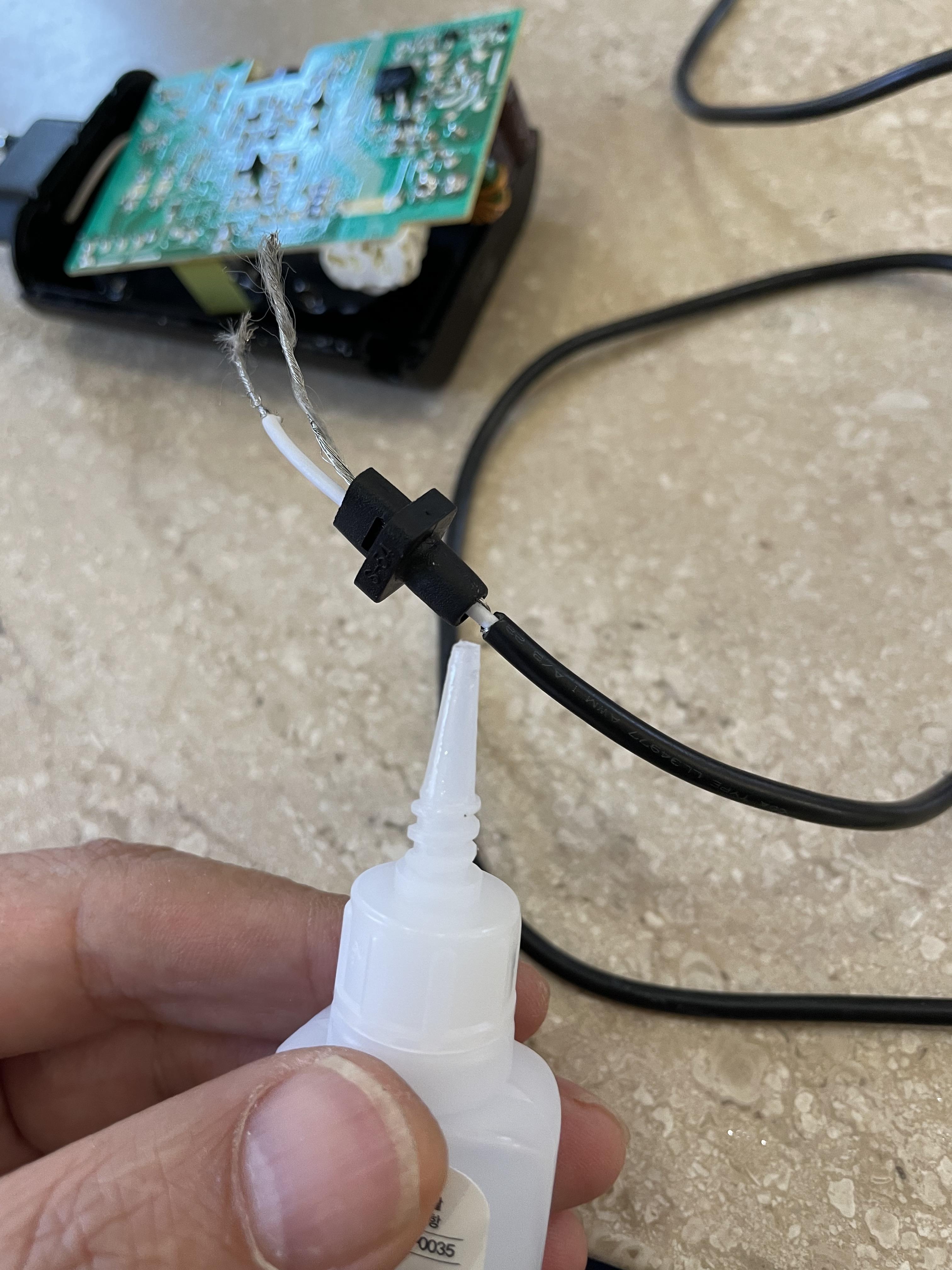 그래서 전선 끝 부분에 살포시 강력본드 처리를 했다. 고무 본드가 더 좋겠지만, 없으니 그냥 한다. 다시 고장나면 새 걸로 사기로 맘먹는다.