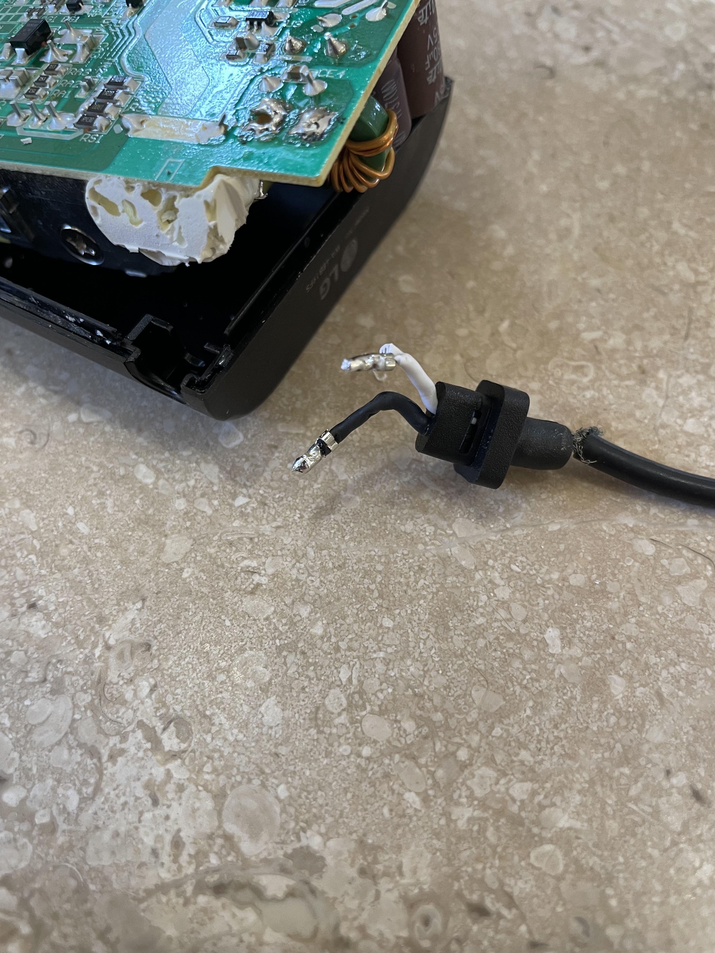 분해하면, 아래 사진처럼 전선을 잡고 있는 고무가 있고, 선은 흰색선, 검정선 두 가닥이 보인다. 흰색 선이 바깥쪽임을 기억하자.