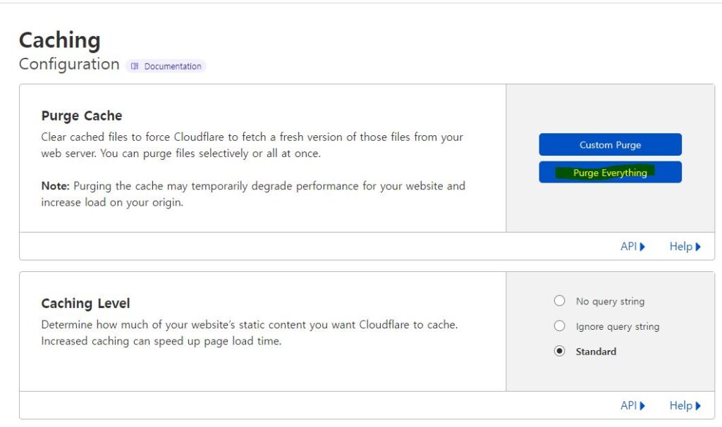 - Cloudeflare 의 경우에는 Cashe 메뉴에서 Cashe Purge를 사용할 수 있습니다.