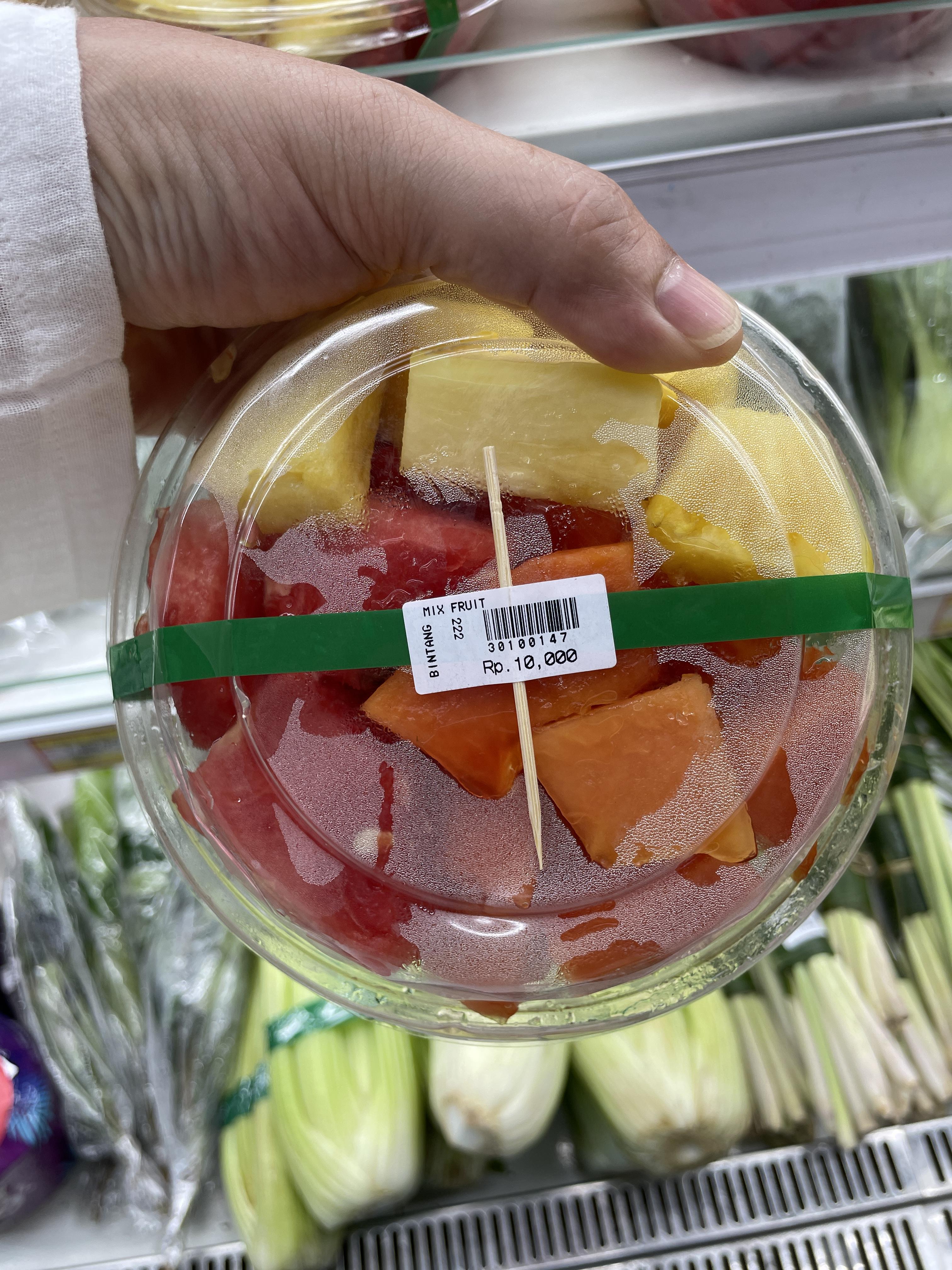 과일 샐러드는 카페에서 대부분 판매하는데요, 30에서 40루피 2500정도 했는데요. 마트에서 보니까, 1000원도 안 했습니다.