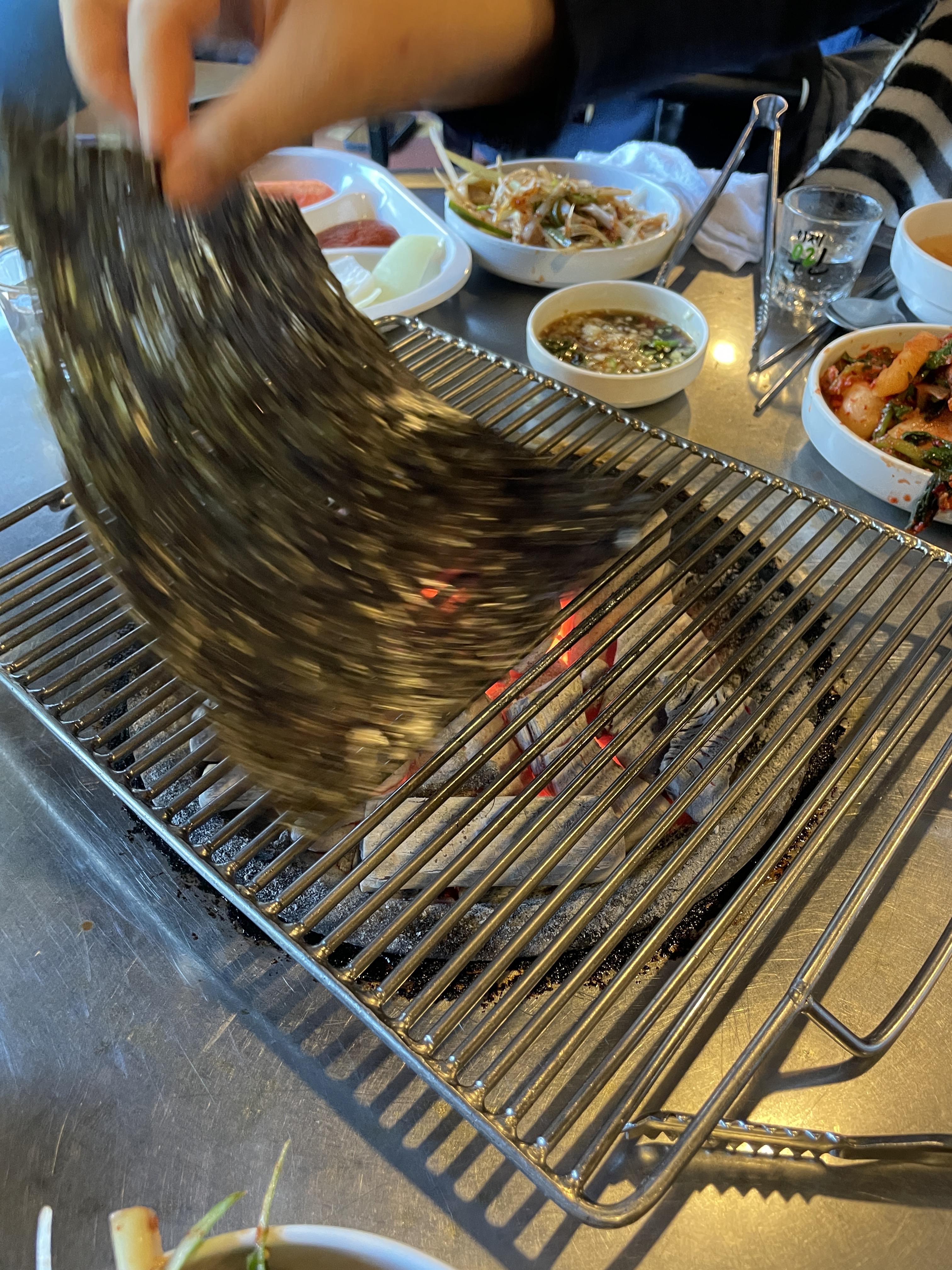 숯불에 고기를 올리기전, 김을 굽는다. 구워둔 김은 잘 잘라두고,