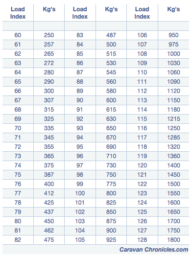 The load rating for the tyre can range from 60 to 130 which equates to a maximum load per tyre of between 250 Kgs to 1900 Kgs. The first thing to check is the tyres are rated for the MTPLM of your caravan, so we need to know the load index ratings.