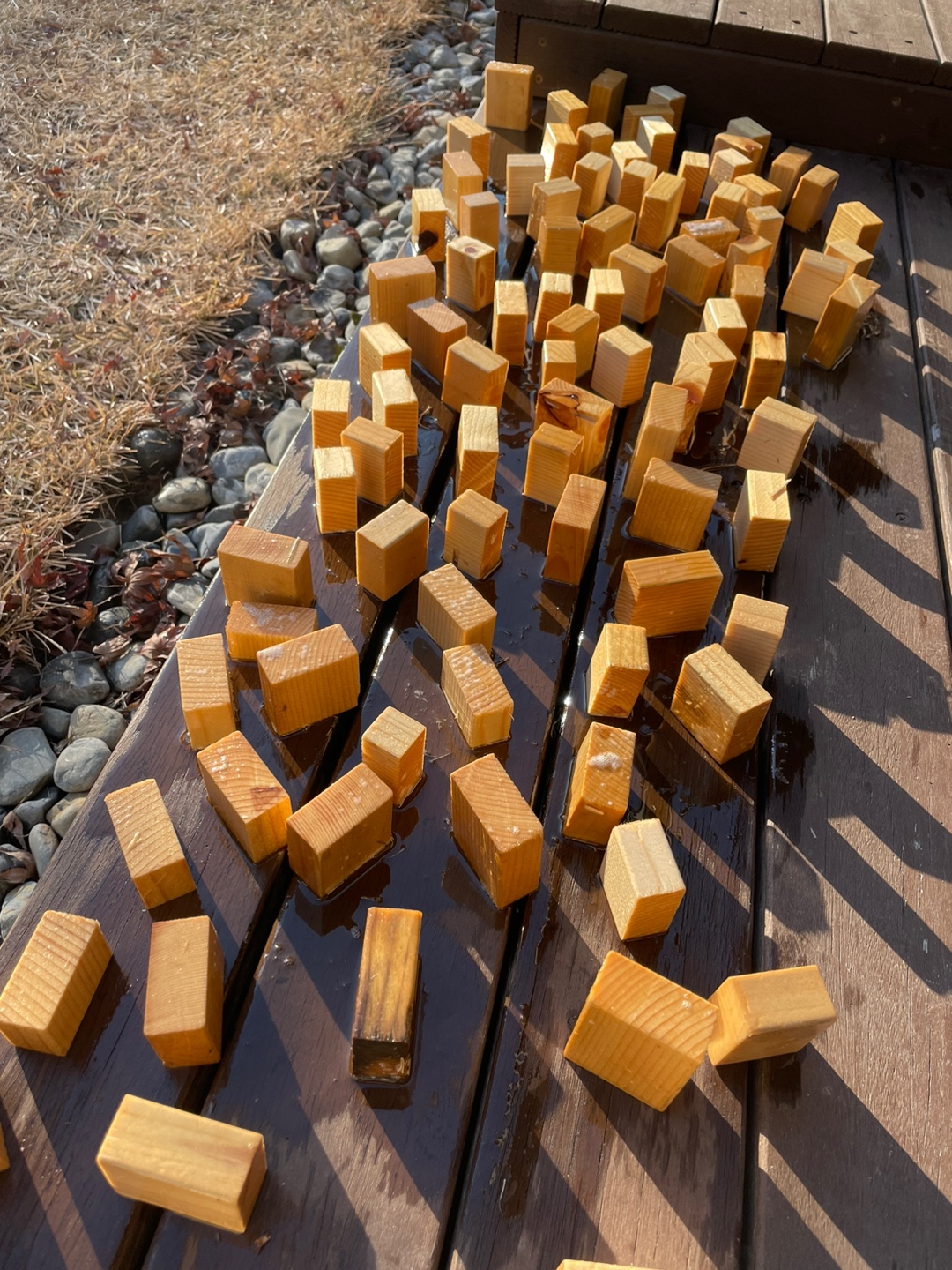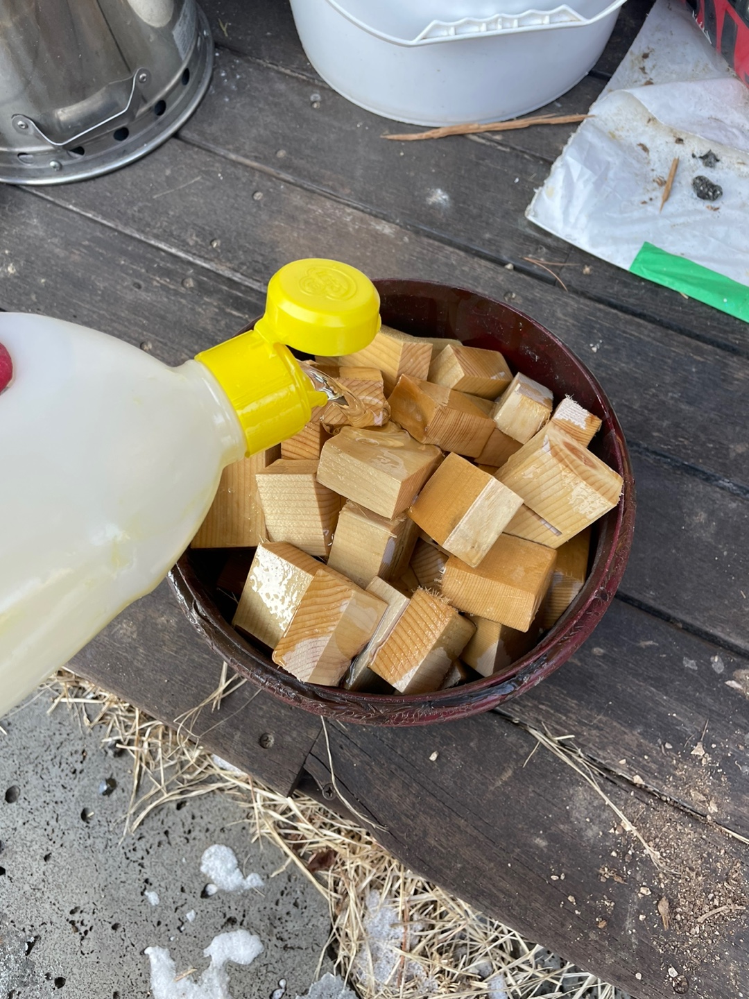 자른 나무를 콩기름을 한통 넣고 잘 저어주었고, 하루 24시간 담궈 두었습니다. 시간이 날 때 마다 나무에 콩기름이 흡수 잘되게 저어 주었습니다. 저는 친환경이라는 생각으로 콩기름을 사용하였는데, 밀납을 사용하는 사람도 있고, 차콜 스타터 등 등 여러 종류가 있을 것 같습니다. 콩기름을 사용해서 성공했다는 말은 못 들었는데 여튼 해 봅니다.