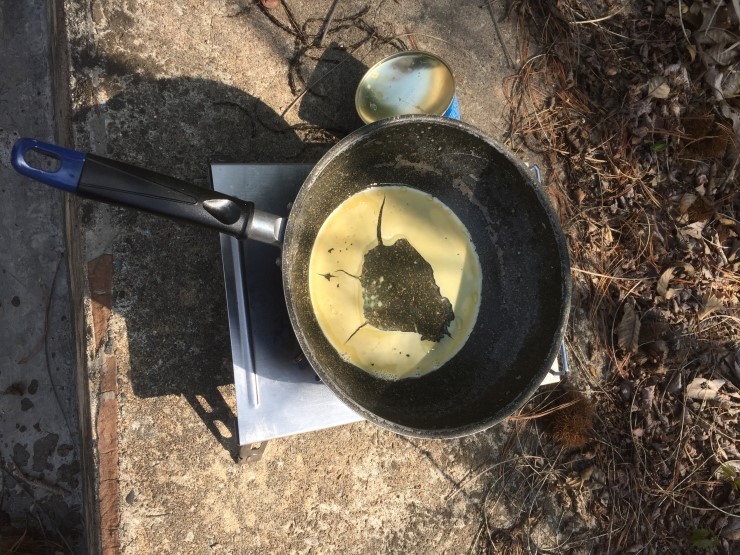소초를 녹이면 이렇게 노란 기름이 뜬 것 처럼 되는데, 이때 가스 불을 줄여준 상태에서 붓으로 플로우 프레임에 발라 주었다. 넘 꼼꼼히 바르지는 않아도 될 것 같아서, 5장을 10분만에 다 발랐다.