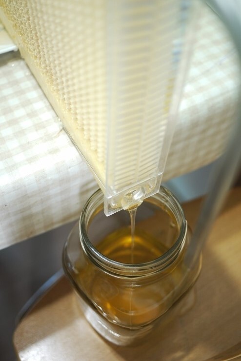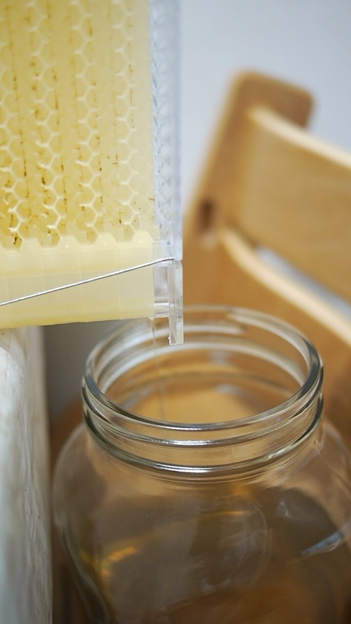 프레임을 집으로 가져와서 채밀해 보았다. 아주 좋은 황금색 깨끗한 꿀이 나왔다. 향이 너무 좋고, 올해 묽은 꿀이 나왔다고 하는데 우리 꿀은 아주 좋아 보인다. 당도도 넘 달아서 머리가 아플 지경이었다.