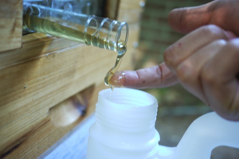 병색 깔을 보면 조금 연한 게 일주일 먼저 수확한 것이고 조금 더 진한 것이 오늘 수확한 꿀이다.