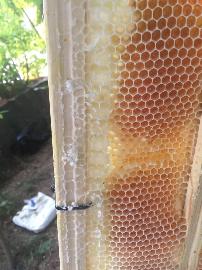 그리고 오늘 21일 밤꿀이 들어오기 시작한지로 10일 정도가 지났습니다. 프레임에는 꿀이 가득들었고, 이제는 입구에서 가장 먼 프레임의 끝쪽에도 꿀을 저장하기 시작했습니다. 조만간 옆쪽에는 밀개할 것 같습니다.