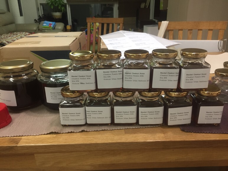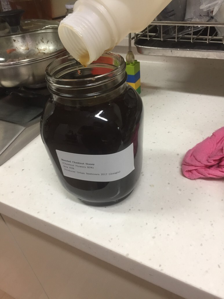 꿀은 총 6개 프레임 중 4개에서만 채밀을 하였는데, 10리터가 나왔다. 10리터를 모두 작은병에 소분하였는데, 모두 선물을 해 주려고 한다.