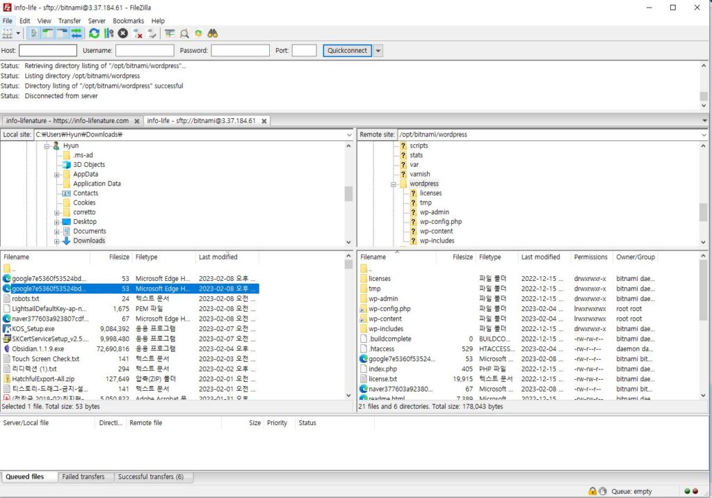 - 파일질라에서 워드프래스 사이트 키로 접속