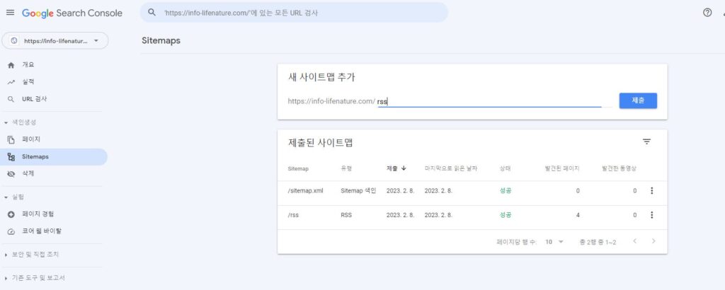 - 소유권 확인이 완료되었으며, 메뉴 Sitemap 에서 rss 및 Sitemap.xml 제출