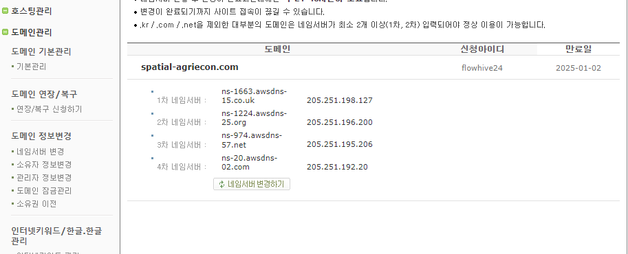 카페24의 경우 도메인기본관리에서 네임서버변경을 선택하고 위의 네임서버로 변경해 주면된다.
