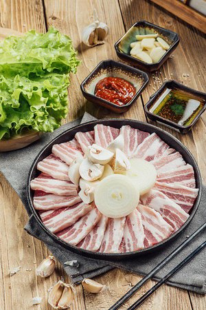 Samgyeopsal is Korean soul food. It serves as a meal, but it is also a popular menu among office workers. It's Korean BBQ, but it's called samgyeopsal because the fat and meat of the pork ribs are stacked in three layers. Recently, Samgyeopsal with the skin is called ogyeopsal. Samgyeopsal is a very popular food in Korea, and it is sold in a variety of forms depending on how it is grilled. For example, preference may vary depending on differentiated methods such as stone plate, direct fire, briquette fire, pot lid, smoked, half-smoked, and on pan. In particular, when eating Samgyeopsal , it is characterized by wrapping it in lettuce like Vietnamese spring rolls, and eating steamed rice suitable for lettuce, a peace of Samgyeopsal , ssamjang, red pepper, green onion, and garlic.
