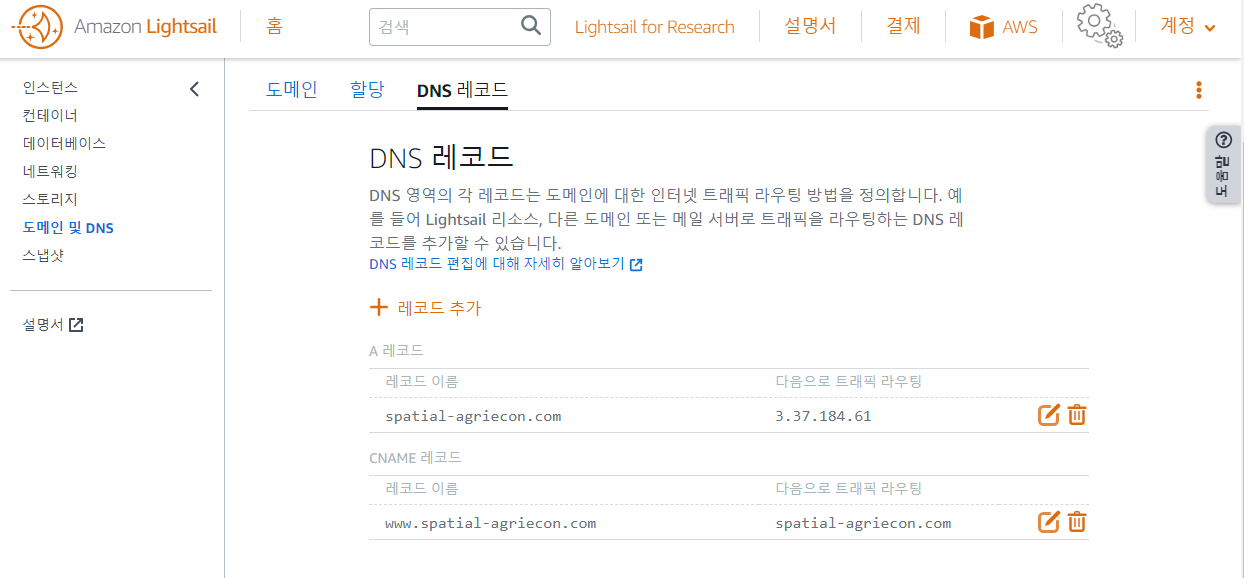 LightSail SSL 인증서 설치 DNS 레코드 (도메인 주소 변경), 구글 검색안되는 경우 도메인 변경 1. 도메인 변경 도메인 변경은 카페24나, 가비아에서 새로 구입한 도메인으로 변경하는 것이다. 하위 도메인 2차 도메인도 해당된다. 참고로 이건 비밀인데 구글에서 검색제외되어 홈페이지가 검색이 안된다면 문제를 해결하고 도메인을 변경한 후 서치콘솔에 다시 등록하면 해결 될 수 있다. 2. 새로 구입한 도메인은 LightSail 에서 변경한다. 등록은 '도메인 및 DNS' -> DNS 레코드 -> 레코드추가 로 이동하여 추가하는데 이때 1) A 레코드 추가에서 @ 레코드 이름으로 추가하고, 2) CNAME 에서 레코드 이름에 www 를 추가해 준다. 나중에 SSL 인증서를 설치할 때 두개다 추가하지..