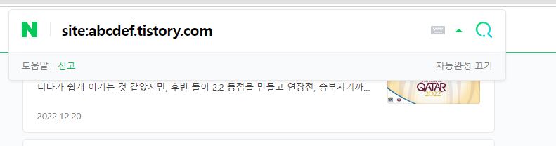 (shorts 팩트) 구글 네이버 다음에서 색인된 글 목록 확인 하는 방법, 검색되는지 확인하는 방법 본 글은 숏 팩트 정리만 하는 글이다. 긴글은 노, 사실만 간략하게 쓴다. 구글, 네이버, 다음 검색창에서 내 사이트 글이 잘 검색되는지, 색인은 되었는지 몇개나 검색되고 있는지 확인하는 방법은 검색창에 site:abc.tistory.com 이렇게 검색해 보면 내 사이트 글이 다 나온다. 글이 나오지 않으면 저품질이나 색인이 안된 것으로 보면 되겠다. Shorts 2023.01.13